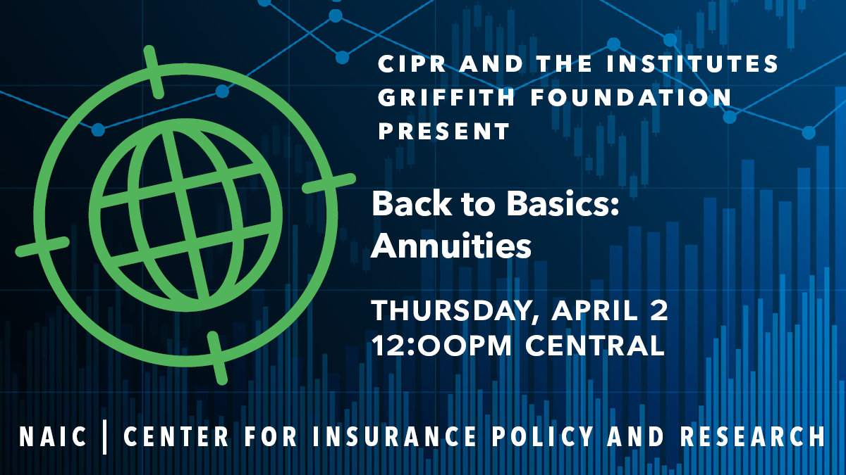 The Institutes Griffith Foundation and NAIC’s Center for Insurance Policy and Research (CIPR) are pleased to bring you the next installment of our Back-to-Basics series on Annuities. This non-partisan and non-advocative webinar aims to provide foundational knowledge to help inform important policy conversations. This session will provide a foundational overview of annuity products, current trends in the annuities market, and today’s regulatory landscape.