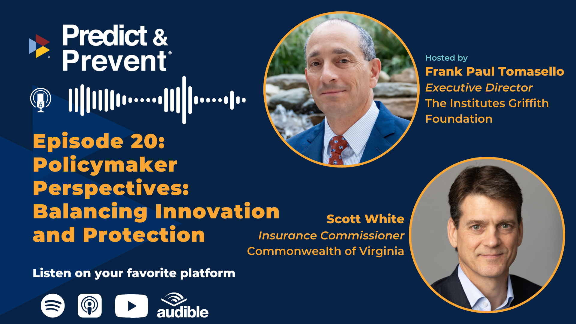 Guest host Frank Paul Tomasello, executive director of The Institutes Griffith Insurance Education Foundation, sits down with Scott A. White—commissioner of the Virginia State Corporation Commission’s Bureau of Insurance and president-elect of the National Association of Insurance Commissioners (NAIC). Together, they discuss how regulators are balancing forward-thinking innovation with the implementation of critical safeguards.