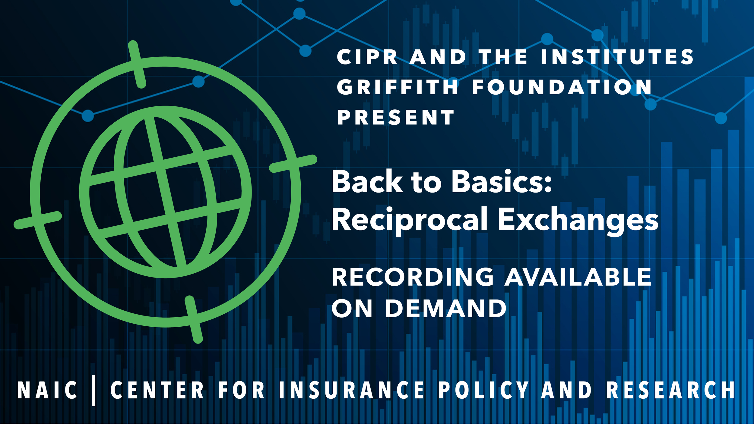 The Institutes Griffith Foundation and the NAIC’s Center for Insurance Policy and Research (CIPR) recently collaborated on the latest Back-to-Basics webinar, Reciprocal Exchanges. This session examines the origins, structure, and regulation of reciprocals, with insights from David T. Russell, Ph.D. (California State University, Northridge), Brian W. Bolash (Erie Insurance), and Bruce Jenson (NAIC).